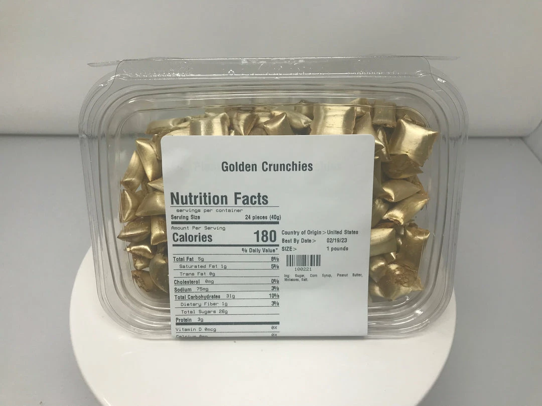 Golden Crunchies. Bite-size molasses flavored nuggets crammed with creamy peanut butter. This listing is for a bulk 1 pound container of Golden Crunchies.