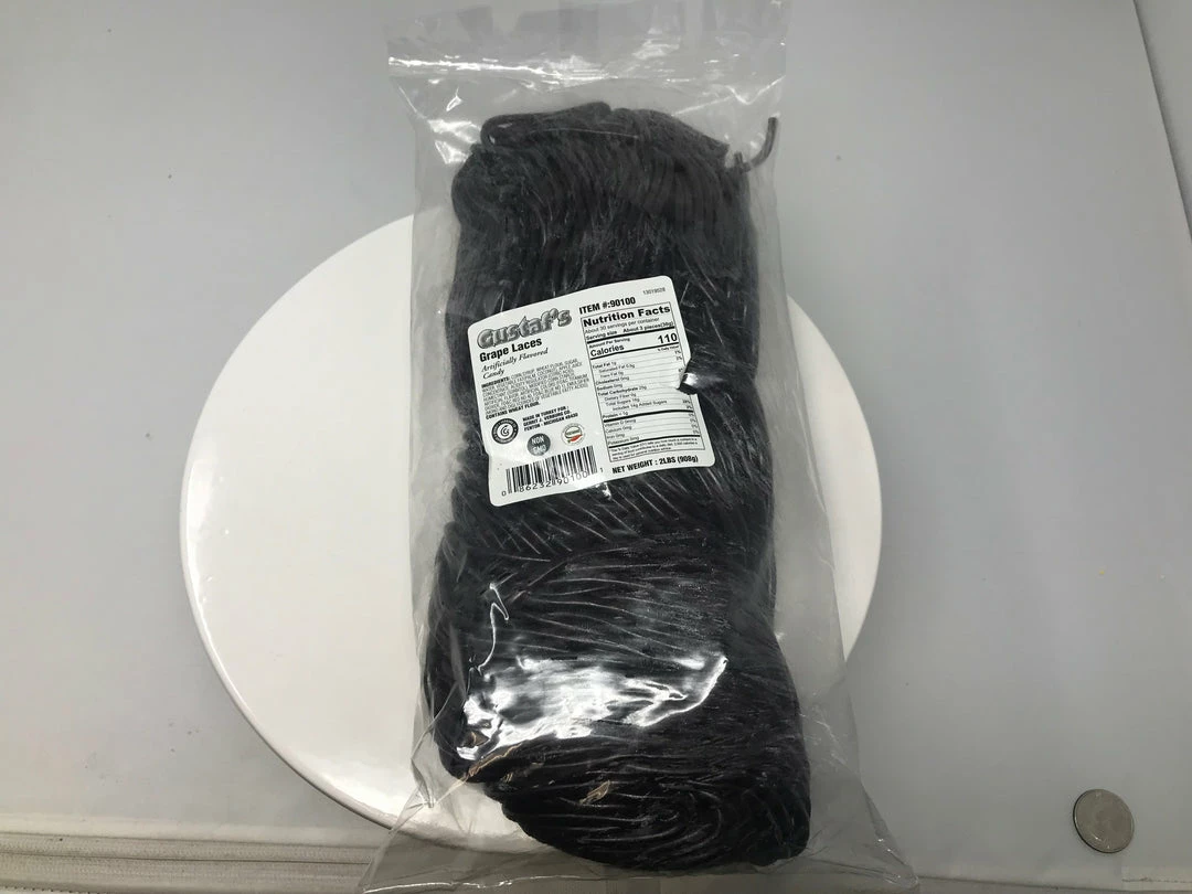 Grape Shoestring Licorice. Made in the Netherlands, this grape flavored licorice shoestring is sure to keep you busy for hours!! This listing is for a bulk 2 pound bag of grape shoestring laces.